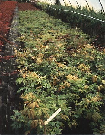 Laub: im Sommer dunkelschwarzrot; sehr fein filigran geschlitzt; 8 – 10 cm breit