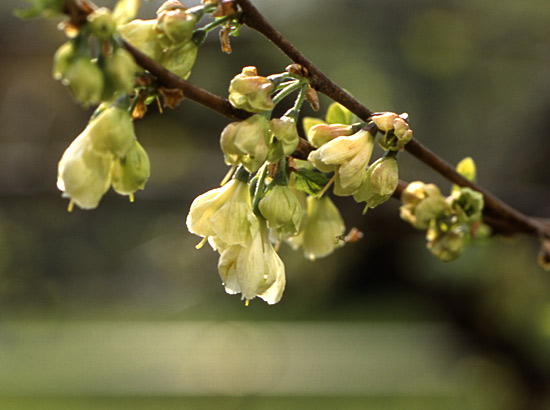 Blüte: weiße Glocken in kleinen Büscheln zusammenstehend, April bis Mai